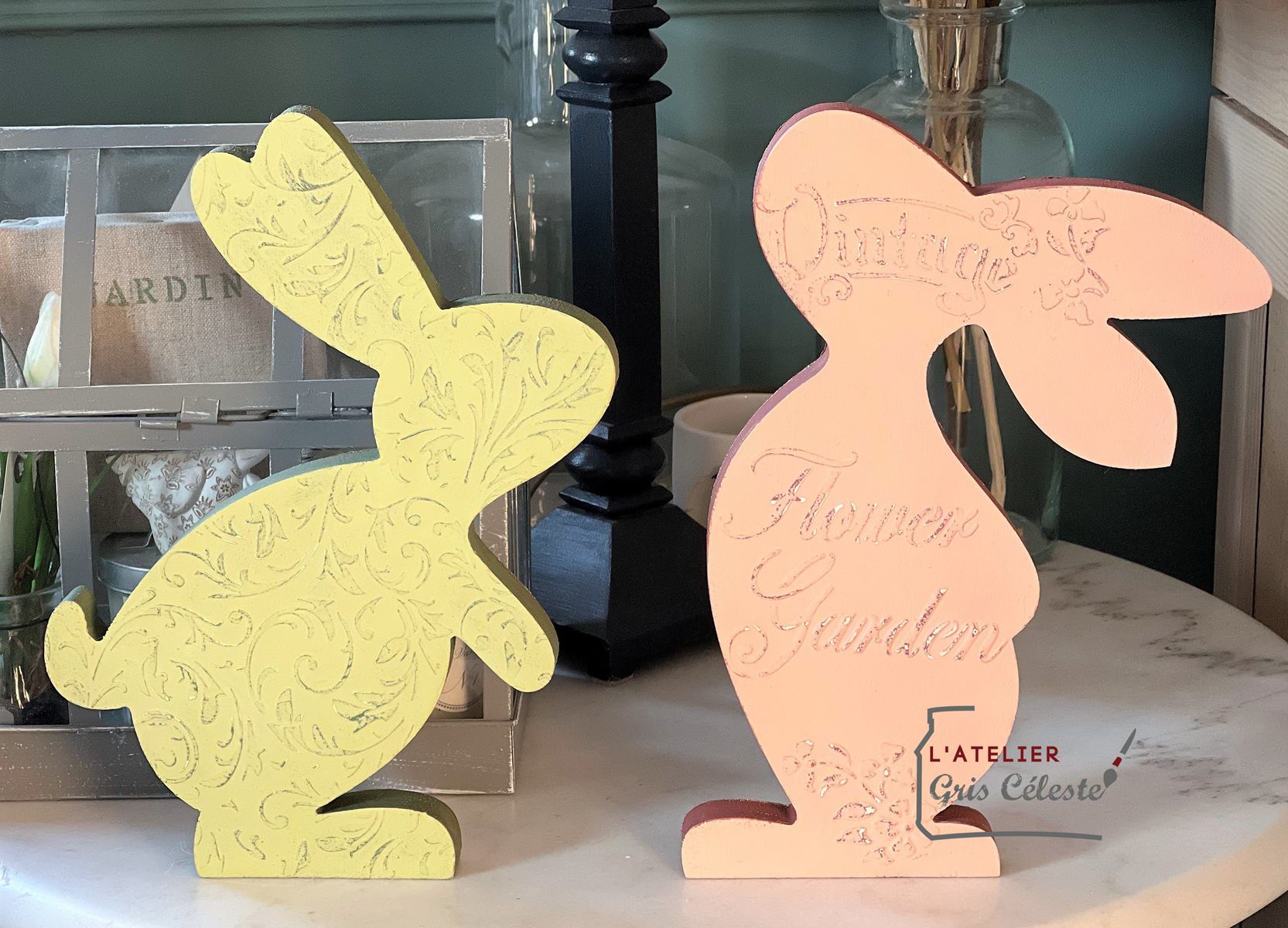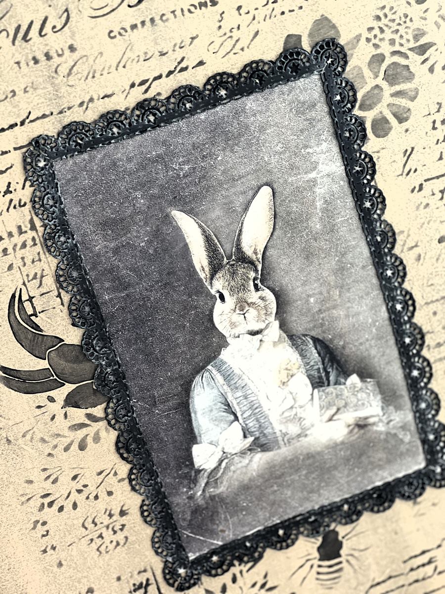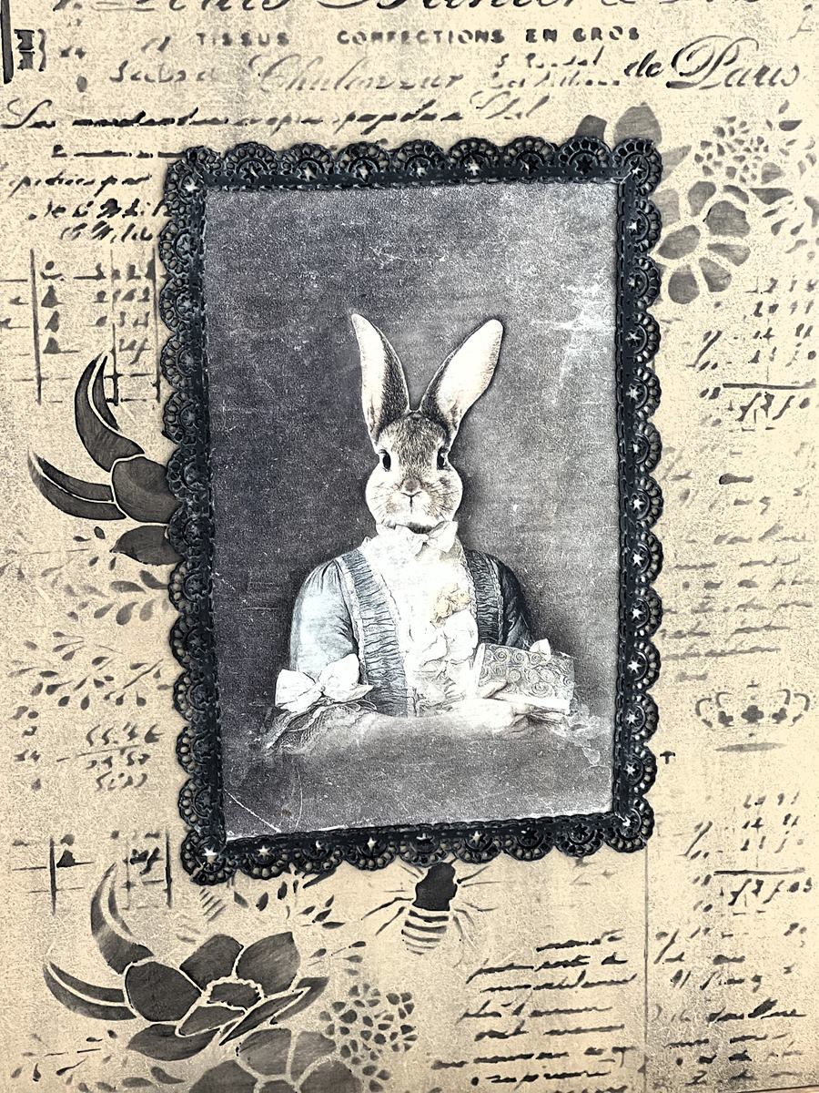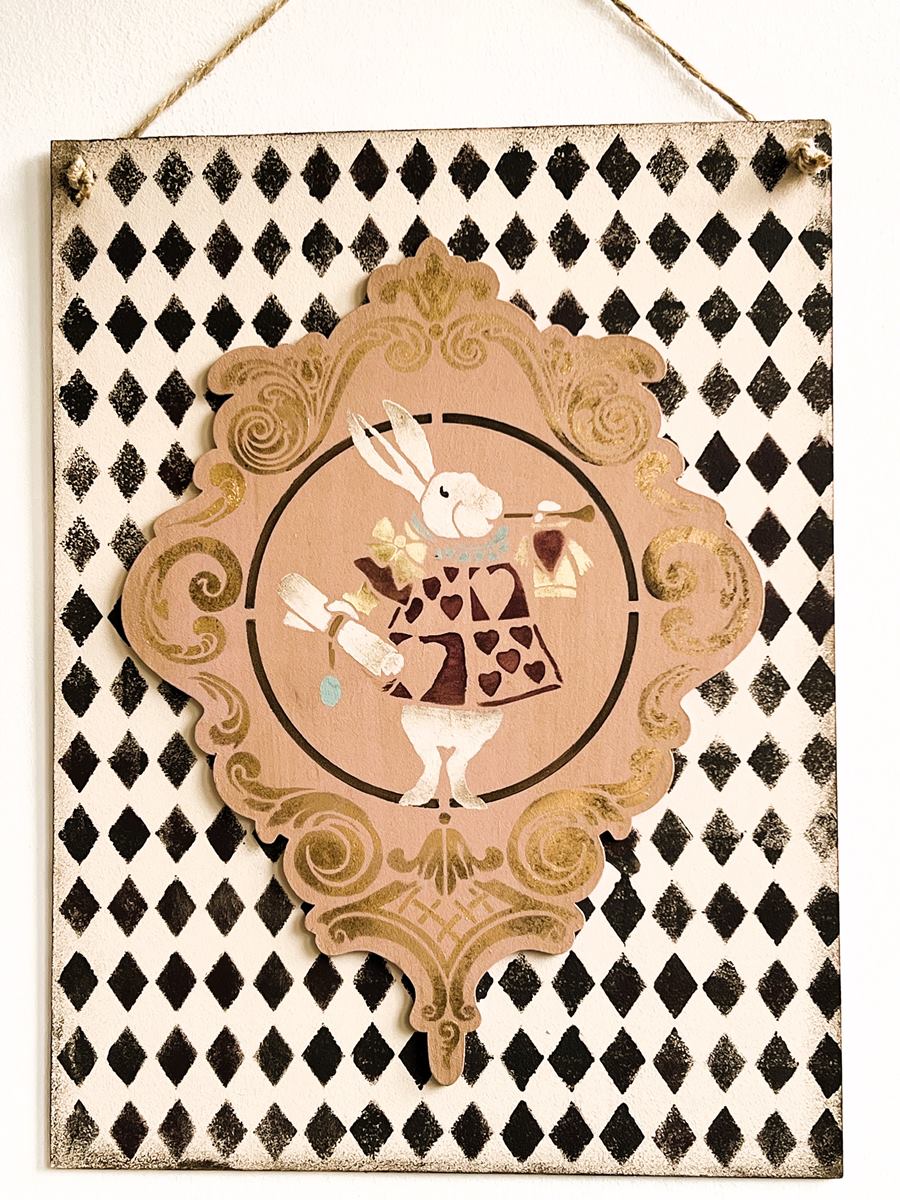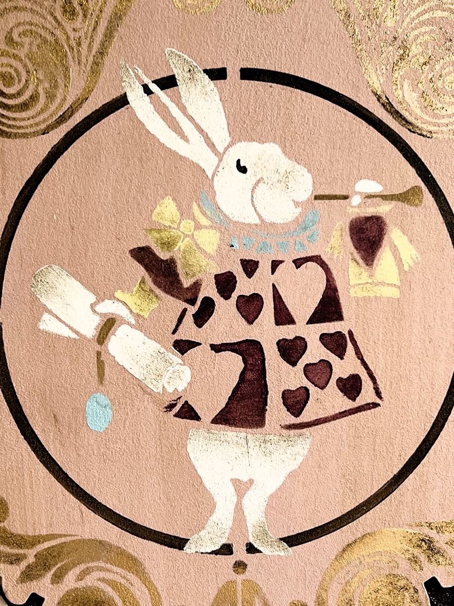Réalisation d'un fond - Pochoir calibré sur pampille - Maîtriser la cire à dorer - thème Lapin d'Alice